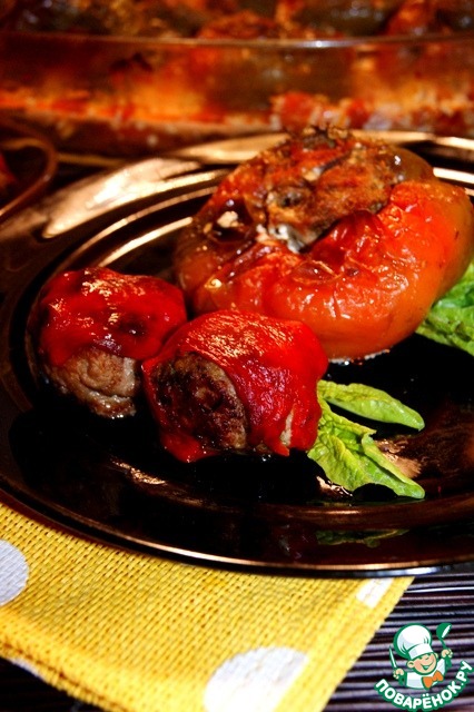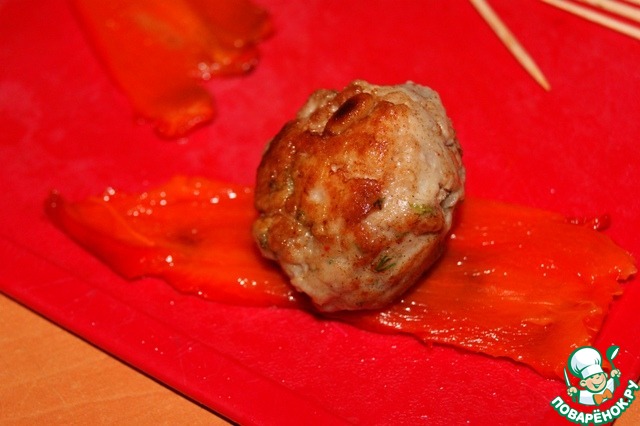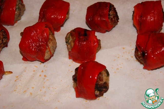 Нарезать перец на полоски и обернуть им обжаренные фрикадели.