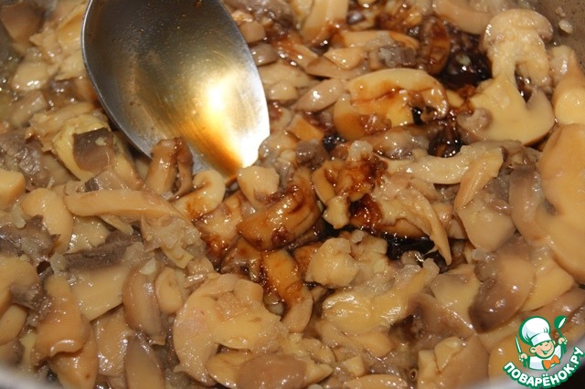 Грибы, лук и чеснок тушить в небольшом количестве масла (1,5 ст. л.) 5-7 минут, в самом конце добавить соевый соус (очень рекомендую, для раскрытия вкуса и аромата), снять с огня и остудить.
