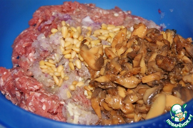 К мясному фаршу добавить натертые на терке лук и чеснок, имбирь, орешки, укроп и грибы. посолить и поперчить.