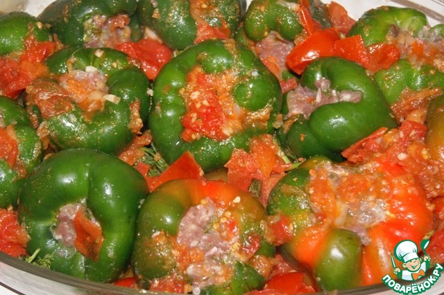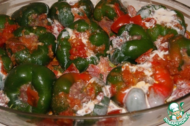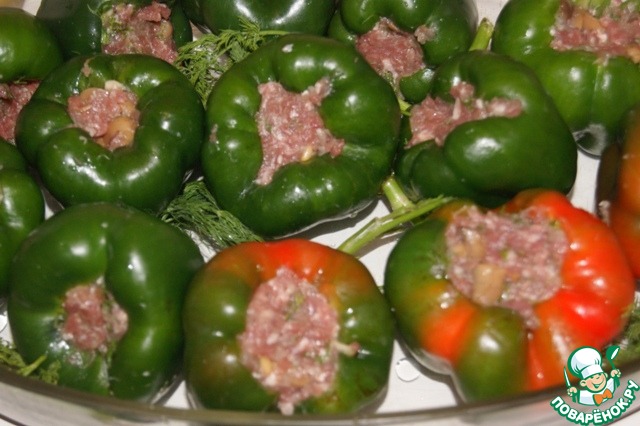 Тщательно перемешать. Очень плотно нафаршировать перец, из которого удалить семена.