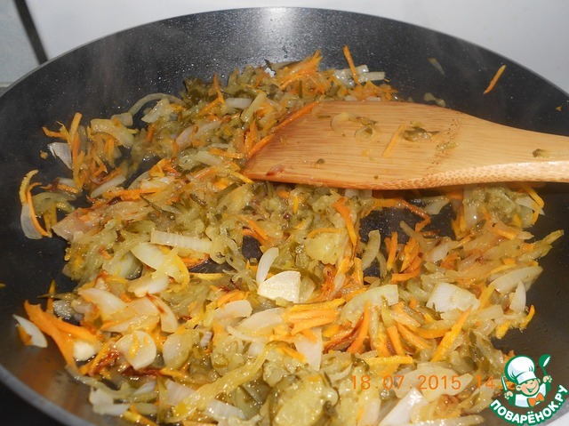 Для начинки: порезанный лук обжарить с, потертыми на мелкой терке, морковью и огурцами (можно добавить грибы). Посолить, добавить укроп