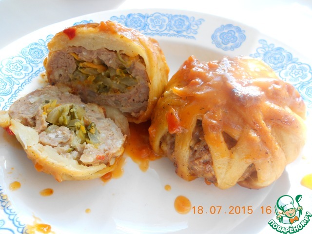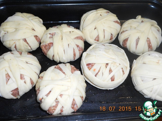 Колобки из фарша обмотать полосками теста чтобы получились клубочки. Поставить в духовку на 20 мин при температуре 180 градусов