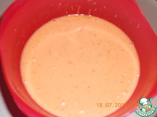 Пока клубочки пекутся приготовим соус: майонез смешать с кетчупом, раздавленным чесноком и добавить воды, чтобы соус получился как жидкая сметана. Добавить зелень, все хорошо перемешать