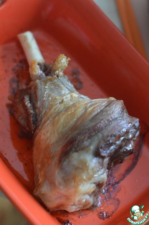 8. Готовую рульку вынуть из соуса, снова выложить в форму для запекания. Верх смазать горчицей и поставить в духовку разогретую до 200С на 5 минут.
