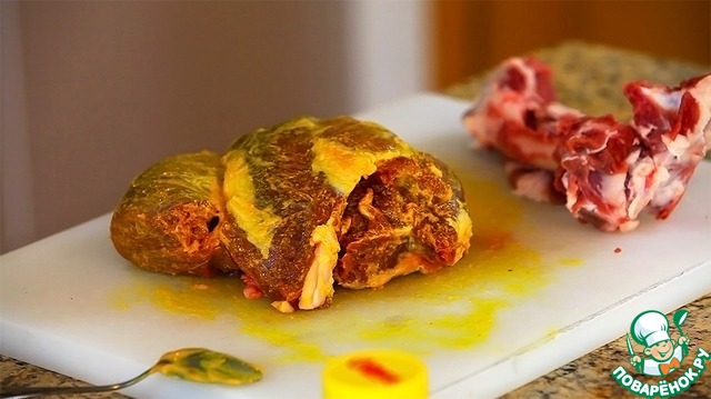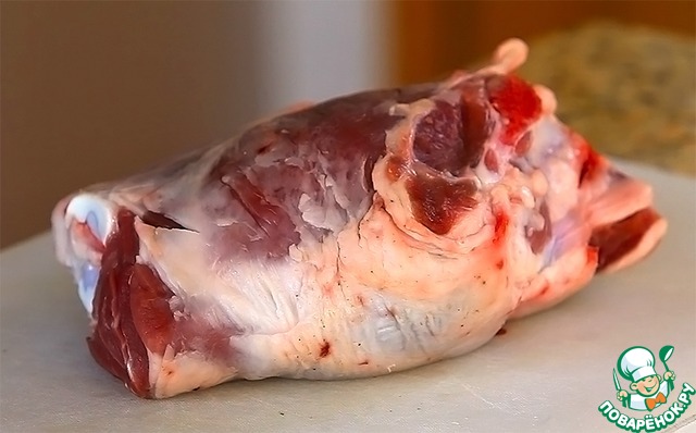 Говоря о куске баранины в этом рецепте я имею ввиду ножку барашка, от которой отделена голяшка и вырезана бедренная кость.