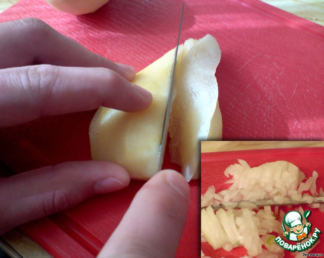 Грушу очищаем от кожуры, нарезаем тонкими пластинами. Лук измельчаем (вот лук резала я:-[ Просто это всегда делаю я – остальные его слишком крупно для меня режут)