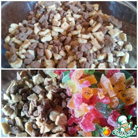 Если мармелад крупный, нарезать его на кубики. Добавить его к печенью