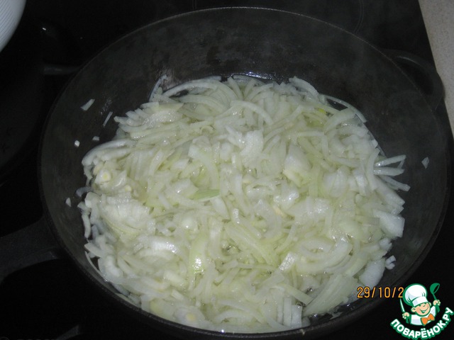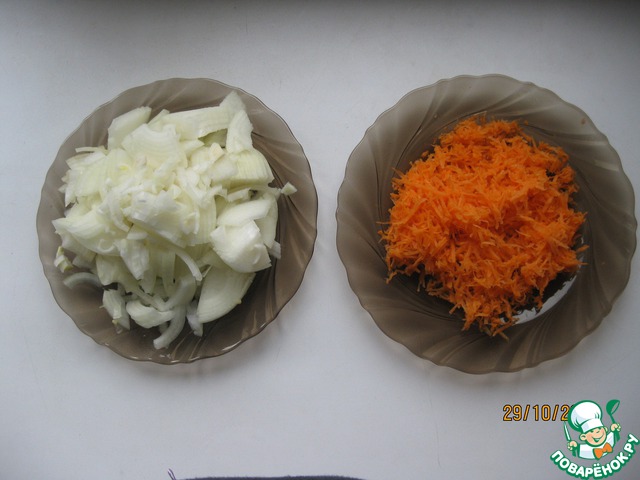 Добавляем к луку морковь. Тушим 5 мин. на слабом огне.
