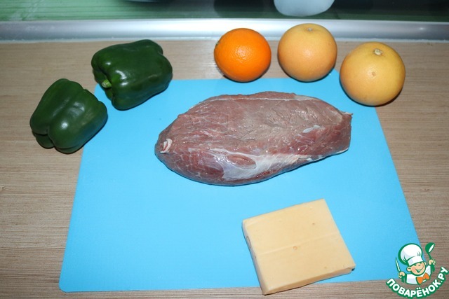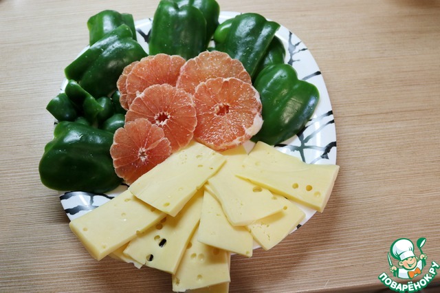 Перец и сыр нарезаем большими пластинами. Грейпфрут чистим и нарезаем колечками.
