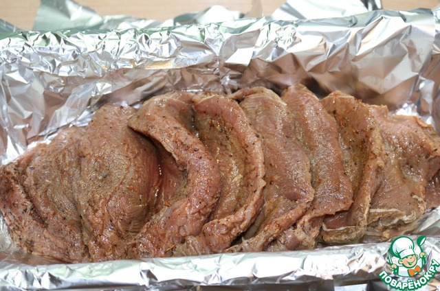 Форму для запекания выстилаем фольгой. (можно делать и в рукаве...) Выкладываем наше мясо.