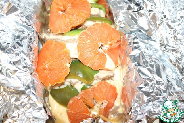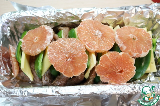 Сверху выкладываем кольца грейпфрута. Закрываем фольгой и отправляем в разогретую духовку до 200 градусов на 1 час.