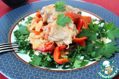 Разрезала куриные бедра на две части (если готовить из филе или целого цыпленка-курицы, то виден примерный размер кусков), посолила, поперчила. Лук разрезала четвертинками колец, помидоры - ломтиками, перцы - полосками петрушку - мелко.