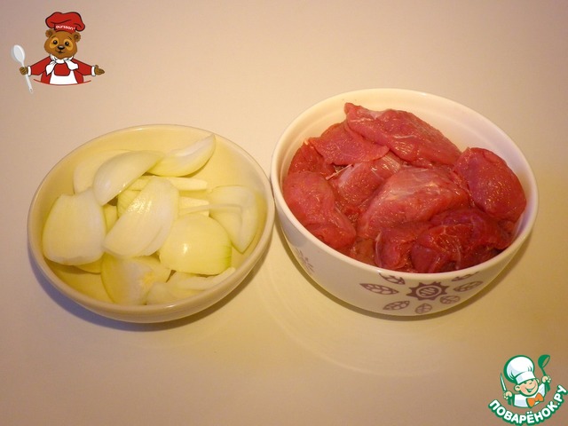 1. Порежьте репчатый лук и говядину на кусочки, которые свободно пройдут через загрузочное отверстие мясорубки.