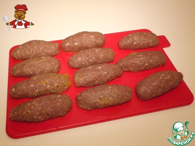 6. Установите на мясорубку насадку для тонких колбасок, поместите в загрузочную воронку овощную начинку и начините ей заготовки для кеббе.