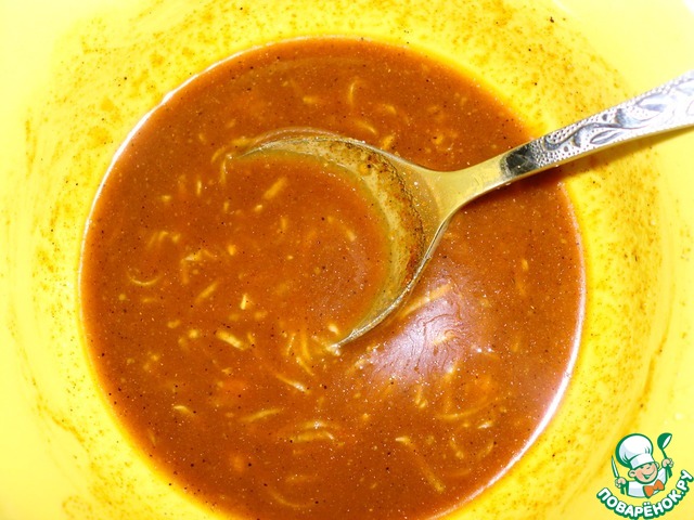Добавляем горчицу, соевый соус, тертый на мелкой терке чеснок, приправы. Немного подсаливаем. Все хорошенько перемешиваем.