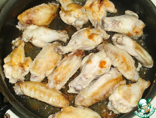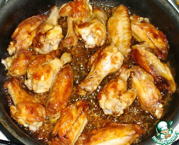 Крылышки должны со всех сторон пропитаться соусом. Соус быстро впитается в крылышки, и на сковороде останется только масло, так сказать))