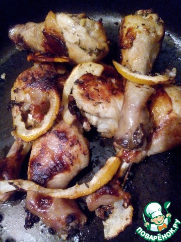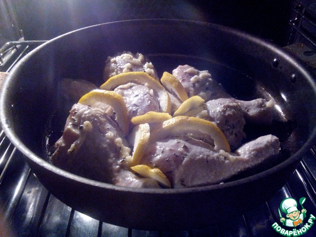 По истечении часа, выкладываем в форму смазанную растительным маслом. Ставим в духовку при 200 градусах на час. Еще я положила между голенями кусочки лимона.