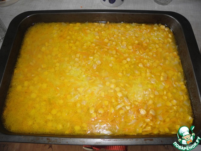 Смесь переложить в деко (форма для выпечки), и залить 4 стаканами кипятка (бульйона).