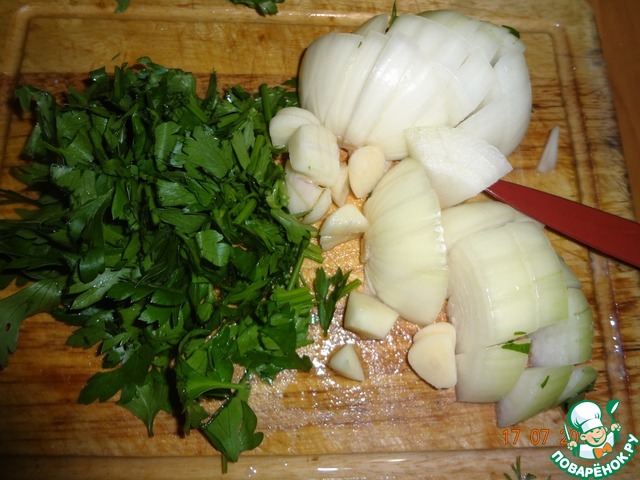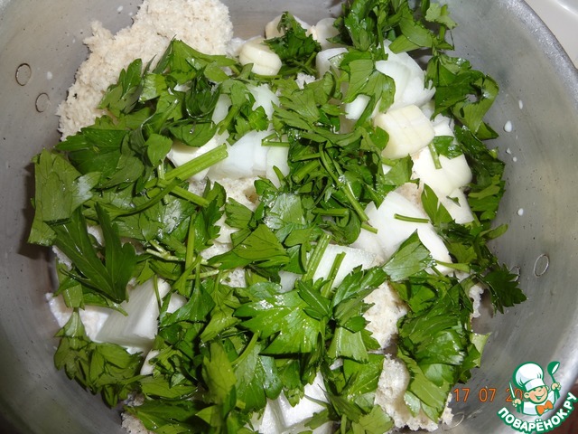 Итак, первым делом замачиваем хлеб в молоке или в воде. Чистим и нарезаем лук, чеснок и зелень (если нет блендера то нарезаем мелко, если есть, то не заморачиваемся и режем крупно)