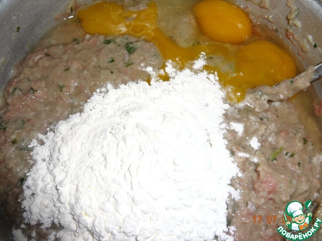 В получившуюся массу, разбиваем одно яйцо (мне просто попалось с 2 желтками) и кладем пару ст. л картофельного крахмала. Если Вам кажется что получилась жидкая масса, то добавьте побольше крахмала. Солим и перчим.