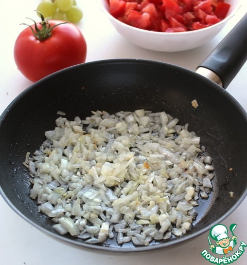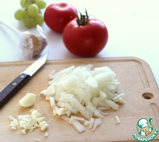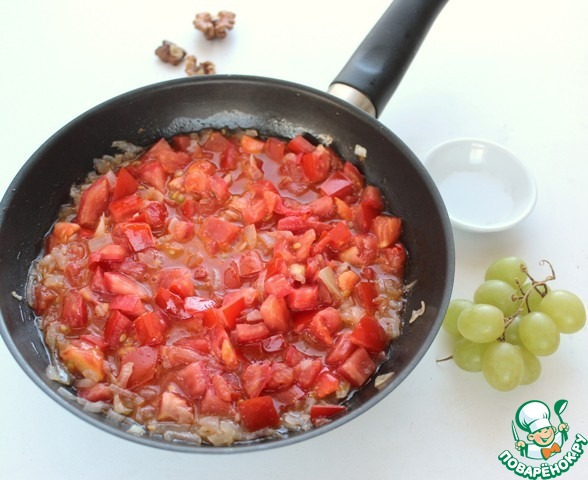 Добавить помидоры в сковороду с луком и чесноком, влить виноградный сок. Варить 15 минут постоянно помешивая.