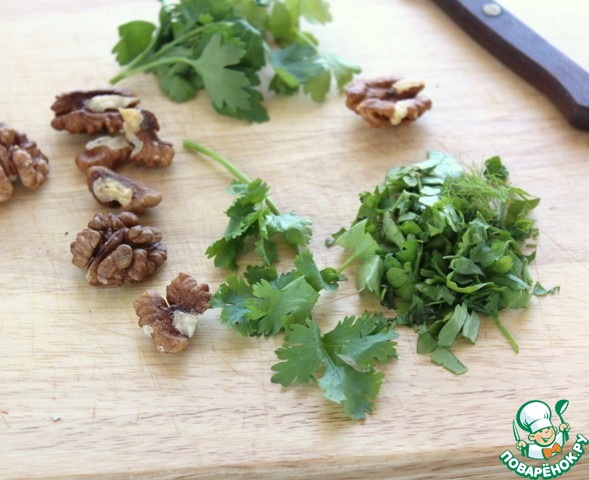 Нарезать пучок кинзы, измельчить грецкие орехи.