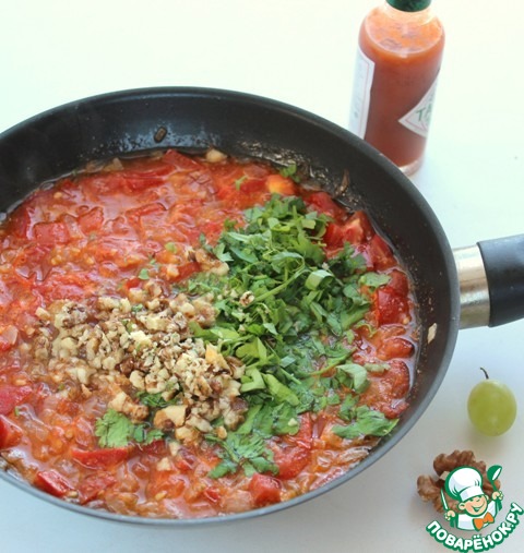 Добавить измельченные грецкие орехи, рубленную кинзу и соус табаско. Посолить, поперчить, перемешать и снять соус с огня.