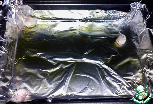 Ставим греть духовку до 180 градусов. Застилаем форму фольгой. Смазываем оливковым маслом. И кладем в форму 2 зубчика чеснока. Я не чистила, просто раздавила ножом, нам это нужно для запаха.