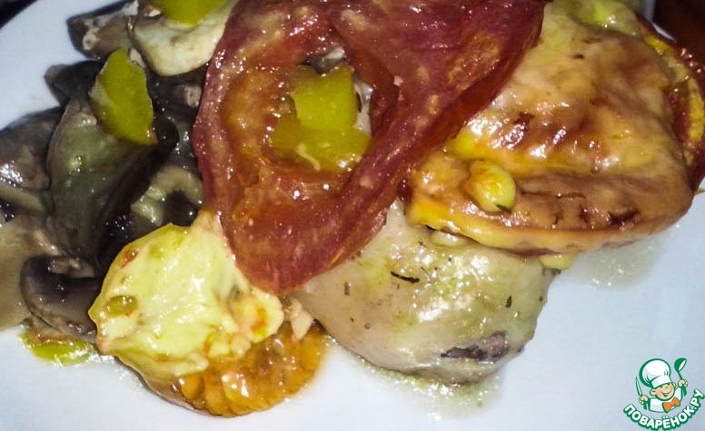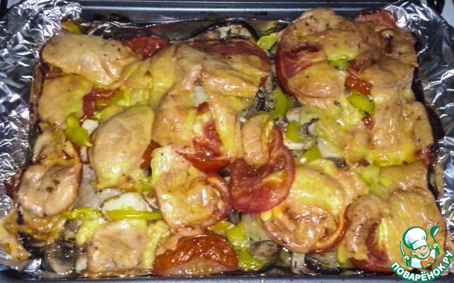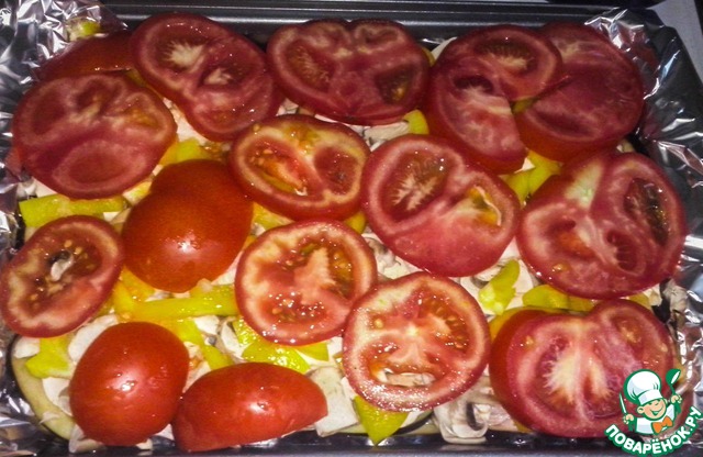 Поверх грибов засыпаем перец и укладываем помидоры.