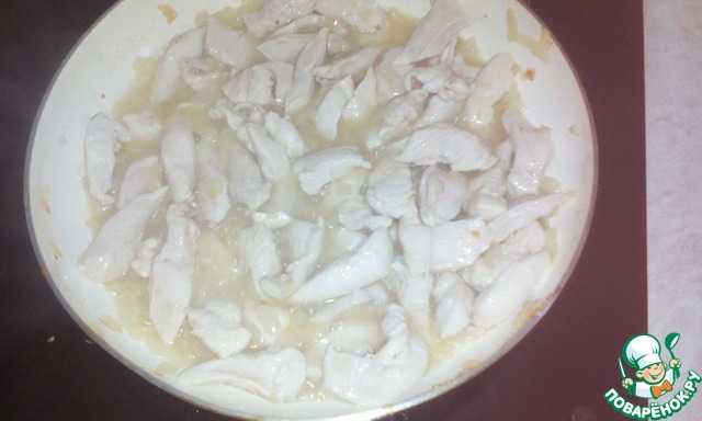 К луку добавляем грудку и перемешиваем. Мясо должно побелеть и выделить сок. Обжариваем примерно 5-7 минут