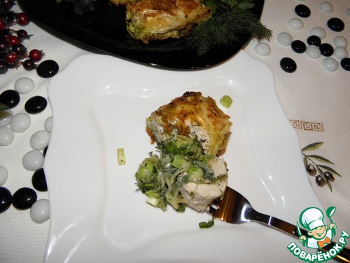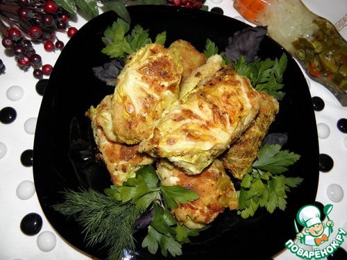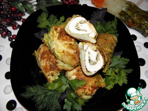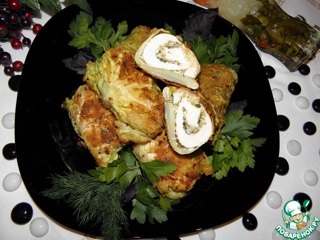 | Из курочки рулеты, ну кто же их не любит! В капустный лист одеты, все очень вкусно будет! И внутри еще начинка, сыр, укроп, зеленый лук! Золотая серединка, мясо сочное вокруг! Очень нежно, ароматно блюдо получается! Кушать до того приятно, может вам понравится! |