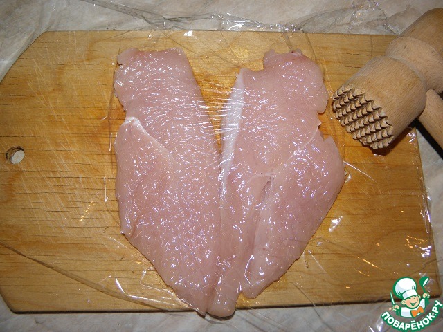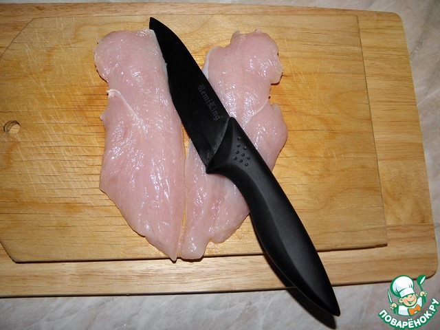 Куриное филе разрезать на тонкие пласты. У меня были маленькие грудки, и получалось на 2-3 части