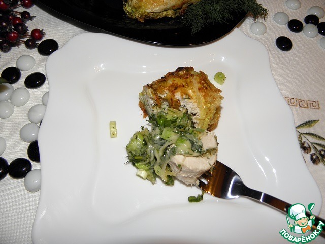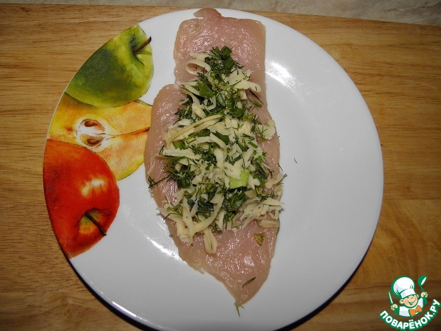 На каждый кусочек филе выложить начинку ( про специи не забываем) и свернуть рулетиком.