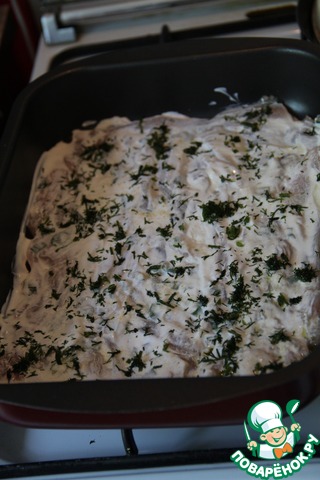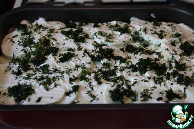 Сверху укладываем наши кабачки (опять же кружочками). Я укладывала их в два слоя, смазывала сметаной, добавляла специи, соль и зелень.