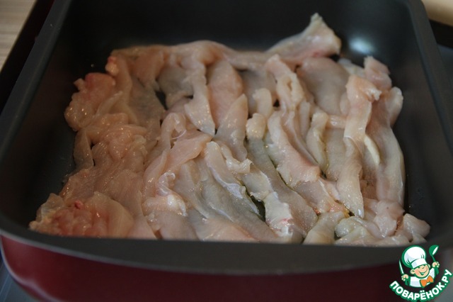 Сначала берем курочку и режем небольшими полосками. Их укладываем на смазанный оливковым маслом противень так, чтобы курица прикрыла дно.