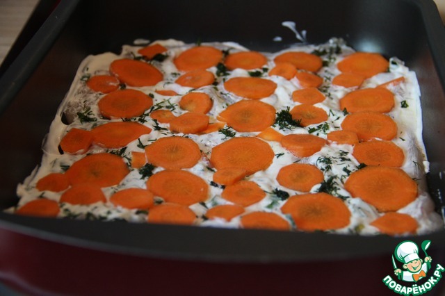 Следующий наш слой - это морковь, порезанная кружочками. Следом за ней укладываем помидоры, порезанные таким же образом. И снова солим, смазываем сметанкой, добавляем специи по желанию.