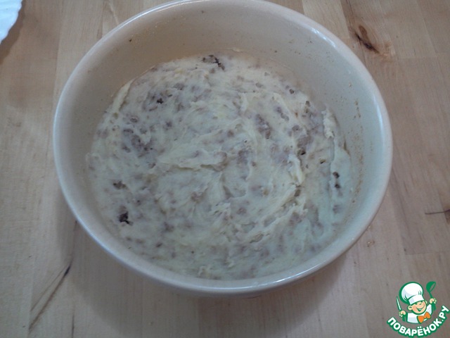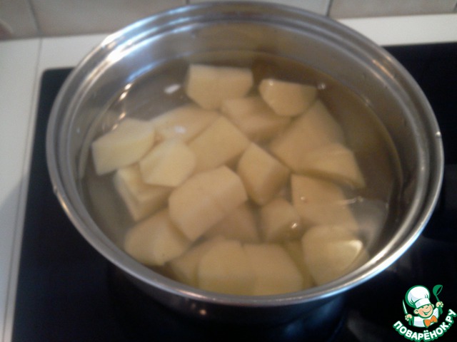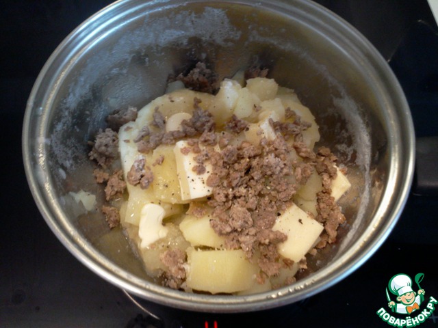 Растираем в пюре картофель с кусочком масла, сыром (я брала комамбер) и двумя столовыми ложками фарша.