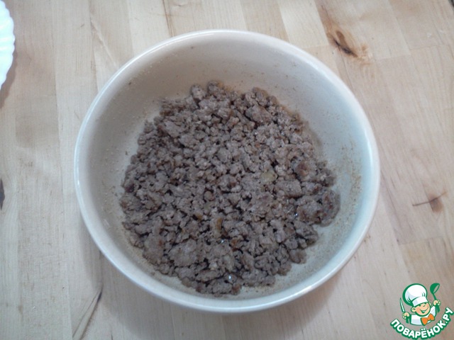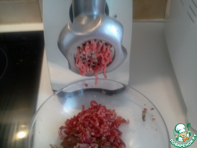 Тем временем мясо с луком прокрутить через мясорубку. Добавить соль и черный перец.