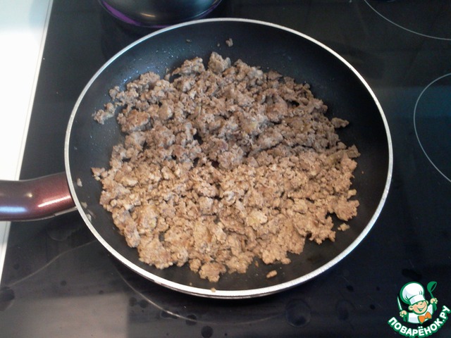 Слегка обжарить фарш на растительном масле до выкипания воды.
