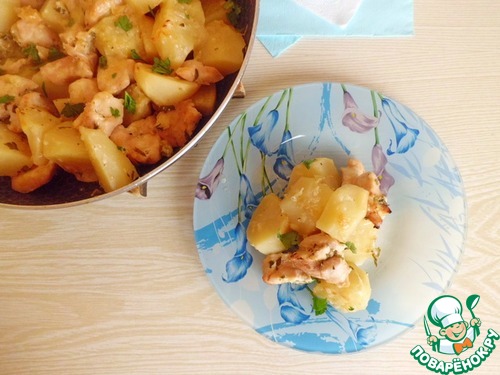 Добавляем картофель, нарезанный средними кусочками, солим, перемешиваем. Посыпаем чили (у меня в порошке).