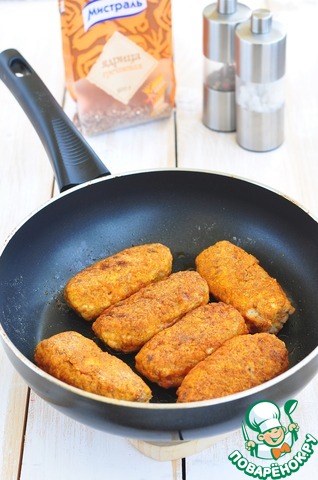 Постоянно смачивая руки водой, сформировать длинные котлетки размером чуть больше указательного пальца. Запанировать в муке, обжарить в малом количестве растительного масла до румяной корочки. Для более красивого цвета и вкуса котлет в муку можно добавить немного красной молотой копченой паприки. Полуготовые котлеты переложить в форму для запекания. Сковороду помыть.