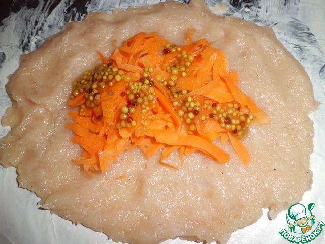 В центр выкладываем морковь, натертую на крупной терке и 1 ч. л. горчицы.