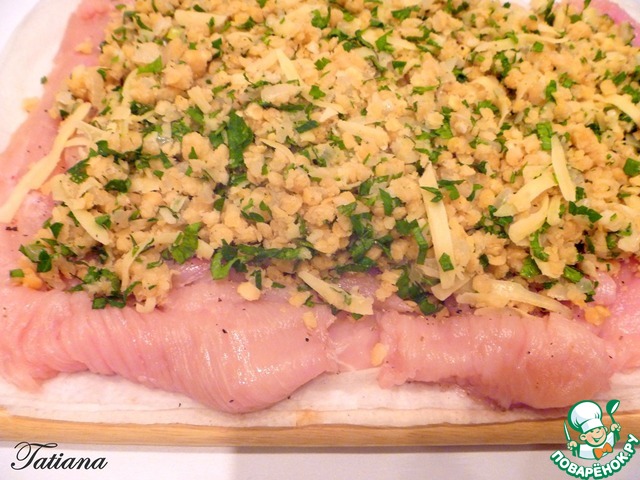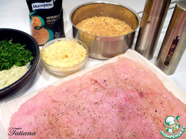 Лук и чеснок мелко порубите, потушите в масле до полупрозрачности, петрушку порубите. В остывшую чечевицу добавьте лук с чесноком, натертый сыр, и петрушку, немного поперчите. Грудку индейки надрежьте вдоль волокон от середины в одну и другую стороны, не дорезая до краев, раскрывается "книгой".