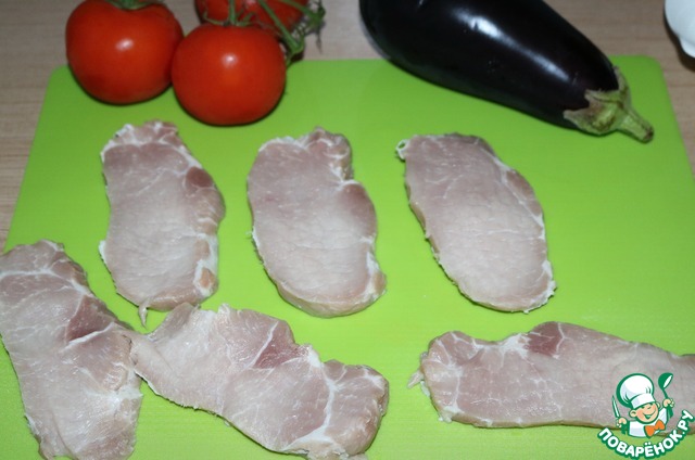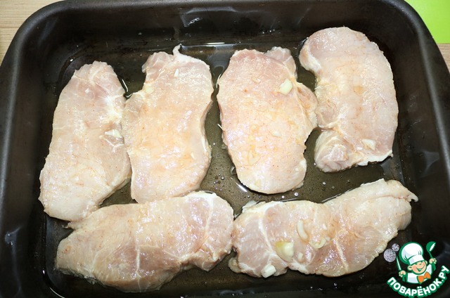 Мясо нарезаем порционными кусочками. Толщиной примерно 1.5 см. Солим и перчим с двух сторон.