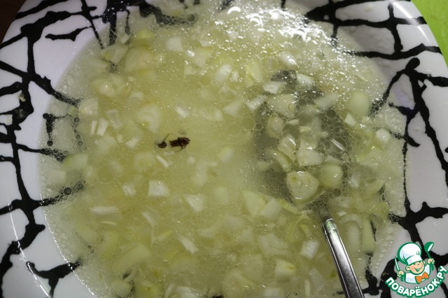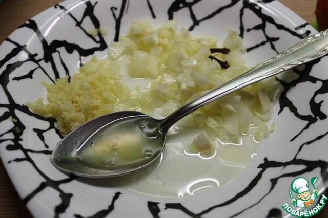 Готовим маринад для мяса. Мелко нарезанный лук, измельчённый чеснок, лимонный сок, гвоздику, масло.