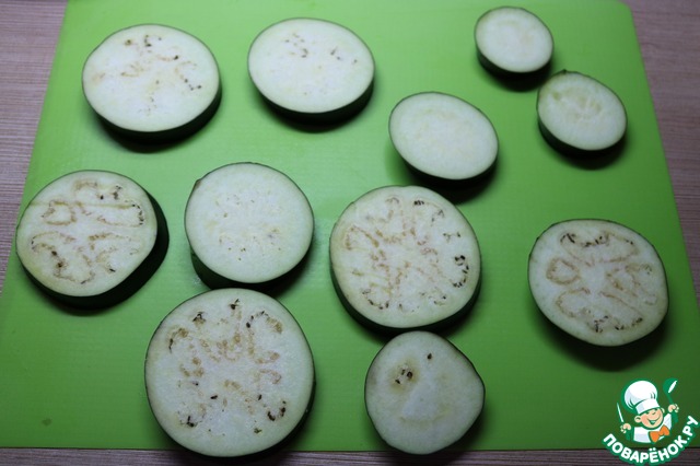 Баклажаны нарезаем толстыми шайбами. Солим с двух сторон.