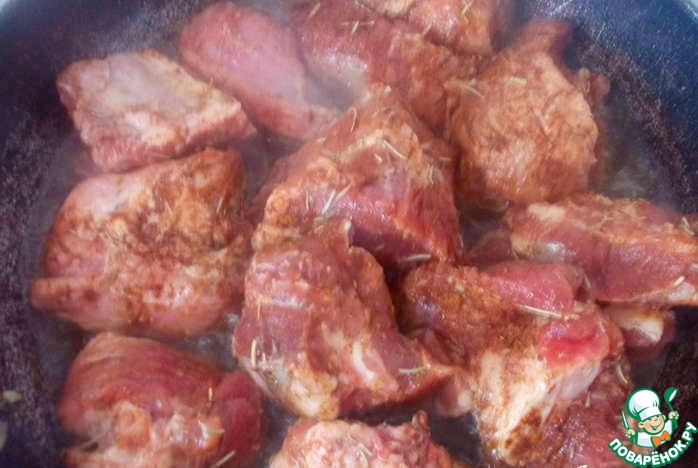 Остальное масло разогреть на сковороде и отправить мясо жарится. На среднем огне, готовим до золотистого цвета.