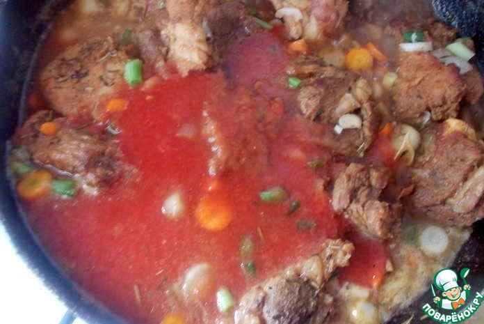 Затем влить свежевыжатый сок из помидоров и снова закрыть крышку. Тушить пока мясо и овощи не станут мягкими.