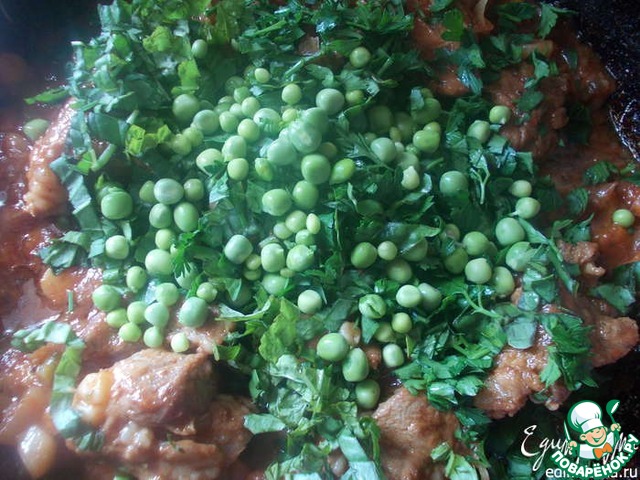 Когда будет все готово, всыпаем молодой горошек, измельченную зелень, если нужно то солим, пару минут тушим и выключаем огонь.