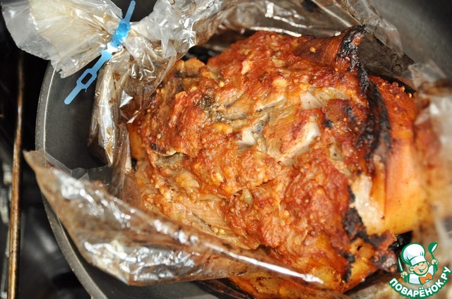 Маринованную рульку ставим в нагретую до 200 градусов духовку и запекаем 1,5 часа. Если у вас рулька больше 1 кг, то на каждый 0,5 кг добавляем 0,5 часа запекания.
